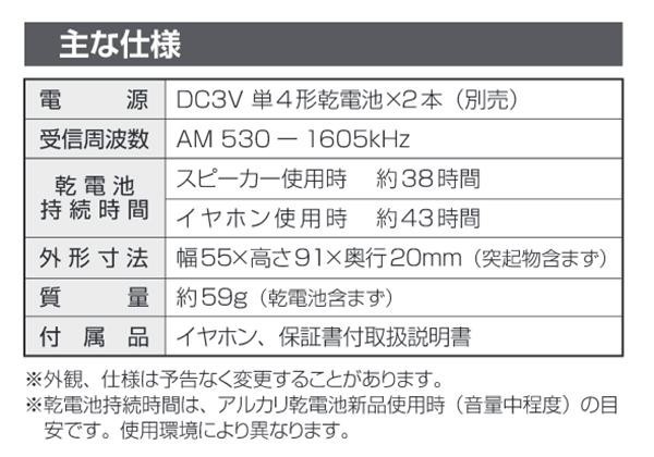 AM専用のシンプルで使いやすいお手軽ラジオです。モノラル受信・スピーカー搭載・イヤホン付属。
