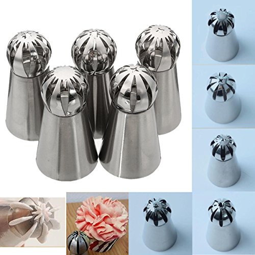 Description: 5pcs Stainless Steel Sphere Ball Icing Piping Nozzle Cupcake Pastry Tips Decor Made from stainless steel material, safe, environmental protection, thermostable, high strength, good hardness and durable in use. Easy to clean and not easy to damage. Suitable for decorating the cake, cookies and some west point making. Disposable forming and not easily deformed. Features details: Material: Stainless steel Color: Silver Size: (L)X(W)X(H) 3.1X2.2X5.6cm/1.22X0.87X2.2inch(appr.) Weight: 72 g Package included: 5 x Icing Nozzles