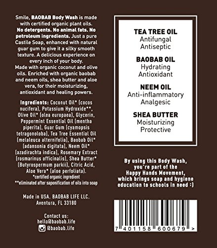 Baobab tea tree & mint body wash is made with the power of Baobab oil. This nourishing oil is cold pressed from the seeds of the Baobab tree, which is widely known as the "tree of life" in many parts of Africa. It has been used for centuries for hydrating and healing the skin and scalp, as well as for hair care. Baobab oil contains moisturizing vitamins a, d, e and f, which help to rejuvenate damaged skin cells. Also rich in omega fatty acids (omega 3, 6 and 9), Baobab oil does anti-aging wonders for the skin by fighting free radicals. It improves elasticity of the skin, is an excellent antioxidant, and a powerful moisturizer. Baobab body wash is made with organic plant oils. No harsh chemicals or synthetic fragrances. Just a pure castile soap, enhanced with natural guar gum to give it a silky smooth texture. A delicious experience on every inch of your body. Vegan, cruelty free and biodegradable. Every sale of this product helps us bring soap and hygiene education to schools in need.Feature