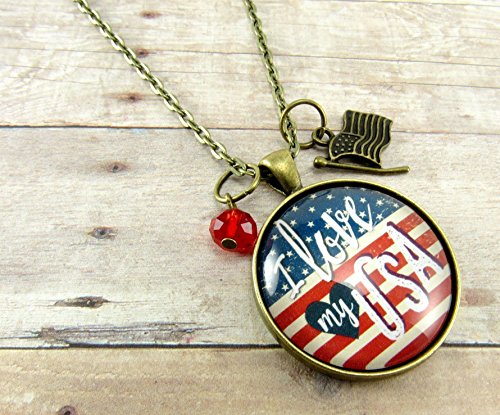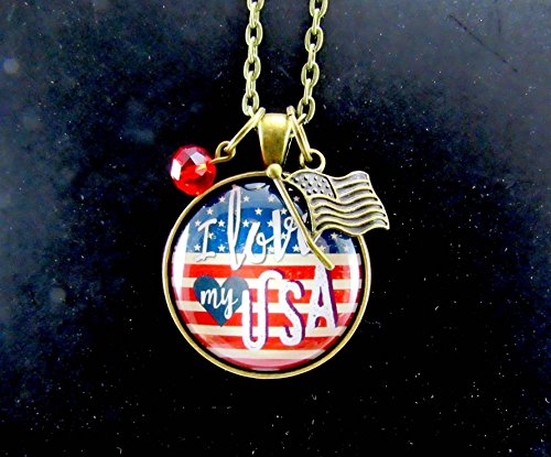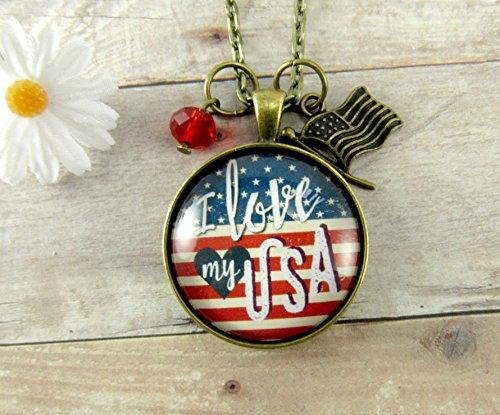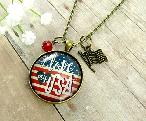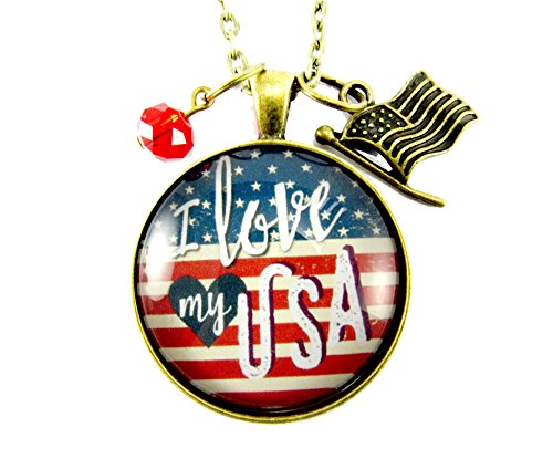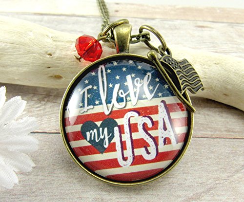 -. Brand : Gutsy Goodness -. Department : womens -. IsAdultProduct : 0 -. ProductGroup : Guild Product -. ProductTypeName : GUILD_JEWELRY -. Title : I Love My USA American Flag Vintage Style 24" Necklace, Glass Round 1.20" Patriotic Hipster Pendant Jewelry, Flag Charm