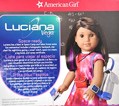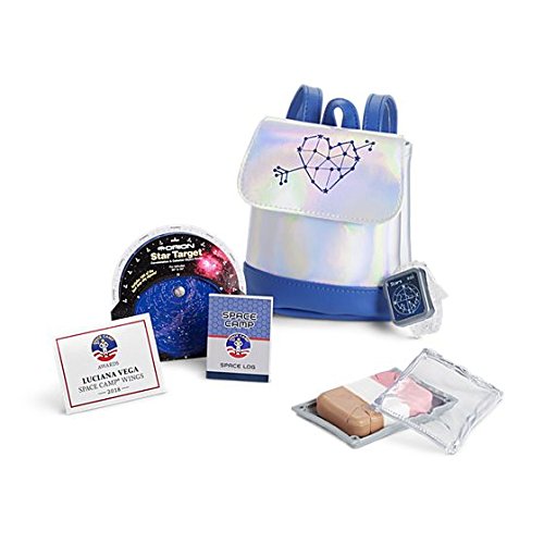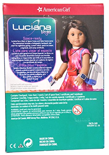 -. Binding : Toy -. Brand : American Girl -. EAN : 0887961569995 -. Feature : A shiny holographic backpack with a constellation graphic / A star chart for nighttime gazing / A pretend smart watch to keep her on track / Pretend dehydrated space ice cream-just like the astronauts eat! / A Space Camp log book to record her progress and a Space Camp graduation certificate -. IsAdultProduct : 0 -. Label : American Girl -. Manufacturer : American Girl -. MPN : FMC76-3A10 -. PartNumber : FMC76-3A10 -. ProductGroup : Toy -. ProductTypeName : TOYS_AND_GAMES -. Publisher : American Girl -. Studio : American Girl -. Title : American Girl Doll 2018 Luciana Vega Accessories (Space-ready Theme) -. UPC : 887961569995