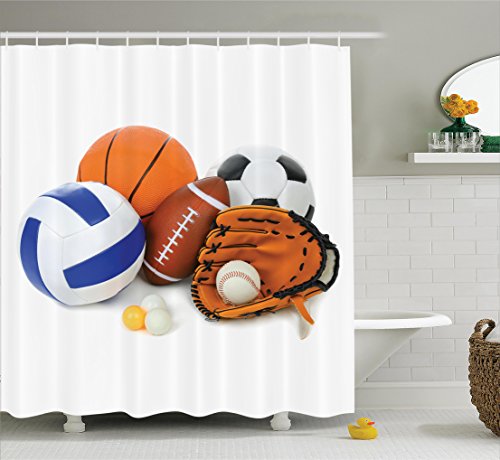 Sports Decor Shower Curtain Set By Ambesonne, Many Different Sports Balls All Together Championship Ping Pong Volleyball Olympics Concept, Bathroom Accessories, 69W X 70L Inches, Multi