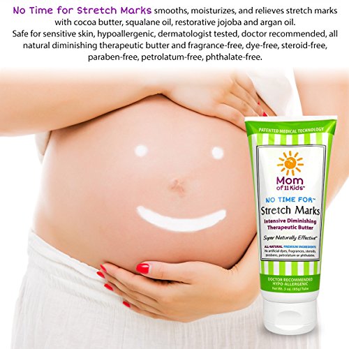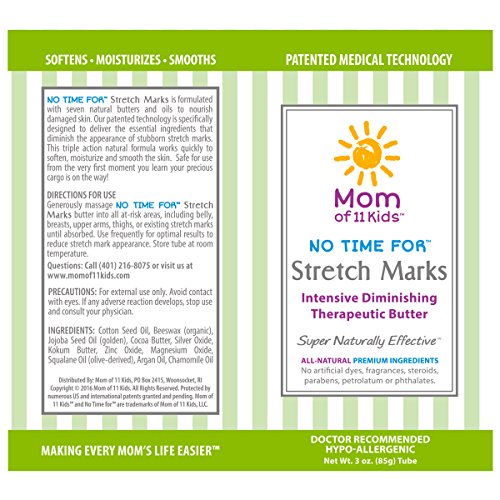 From Tami, the Mom of 11 Kids Pregnancy is remarkable; your body stretches perfectly to fit your baby. Unfortunately, that incredible elasticity doesn't always work in reverse and can leave a road map of unwanted stretch marks that lasts long after your baby is born. Definitely No Time for That! No Compromise on Quality Our patented medical technology in No Time for Stretch Marks ointment is specifically designed to minimize the appearance of even the most stubborn marks. It is more than just powerful - it's "go ahead and buy that bikini today" confidence. Naturally Effective No Time for Stretch Marks is formulated with seven natural butters and oils to nourish damaged skin. Our patented technology is specifically designed to deliver the essential ingredients that diminish the appearance of stubborn stretch marks. This triple action natural formula works quickly to soften, moisturize and smooth the skin. Safe for use from the very first moment you learn your precious cargo is on the way! What Do Moms Like About Mom of 11 Kids? ? All-natural premium ingredients ? No artificial dyes or fragrances ? No steroids, parabens, petrolatum, phthalates ? Never tested on animals ? Made in the USA