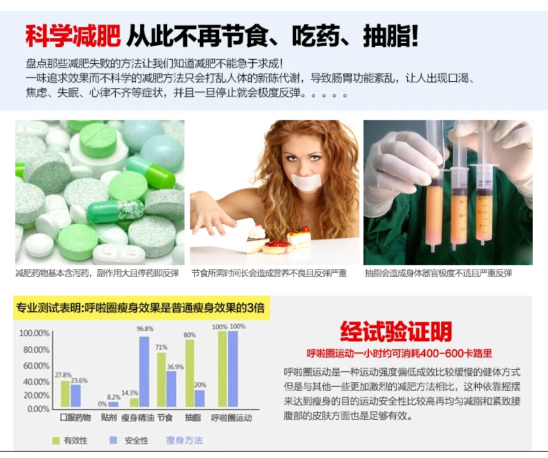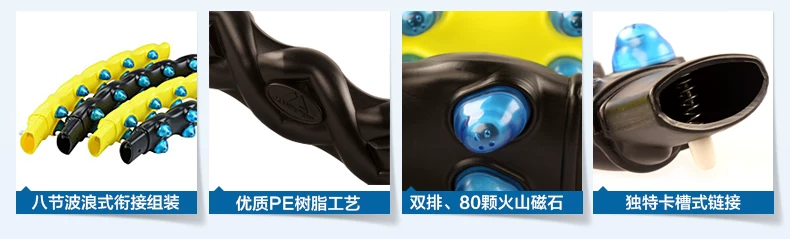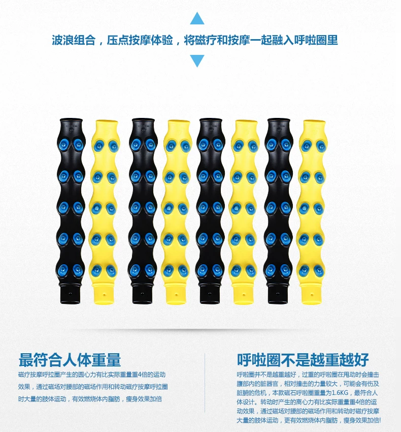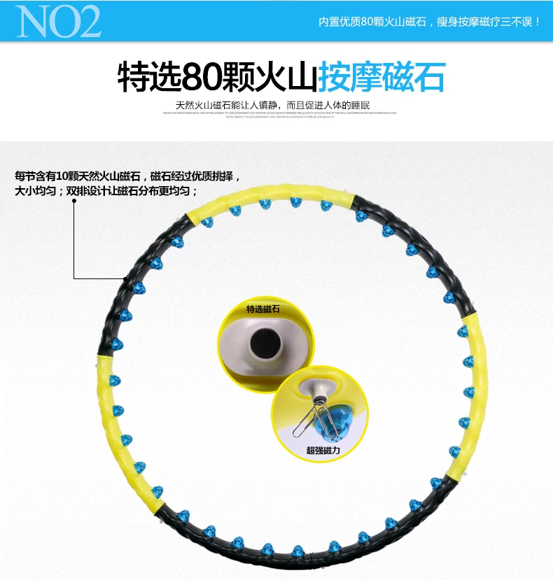注意事项:提醒大家本款呼啦圈是我们定制的加重减肥瘦身款哦,亲们运动的时候一定一定要佩戴护腰哦,以免长时间的转动给腰部带来负担,腰部需要一个适应的过程。本款呼啦圈依据人体工程学原理,将80颗火山按摩磁石均匀分布,采用点压按摩方式,持续挤压腰腹部赘肉,使脂肪受热燃烧,与此同时高达5000GS+磁感应线均匀切割脂肪细胞,使作用区域内卡路里热量加速消耗,从而达到快速减肥的目的。