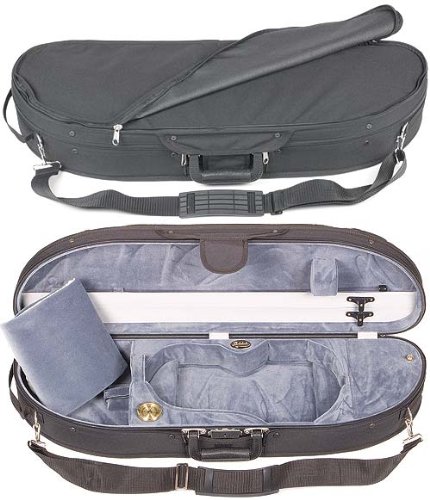 -. Feature : Black exterior with gray velour interior with suspension / A beautifully designed and economical case / Hygrometer, humistat, two bow holders, velcro neck restraint, blanket and accessory pocket / Screw attached canvas cover with music pocket, D-rings, subway strap and shoulder strap / 4/4 violin size