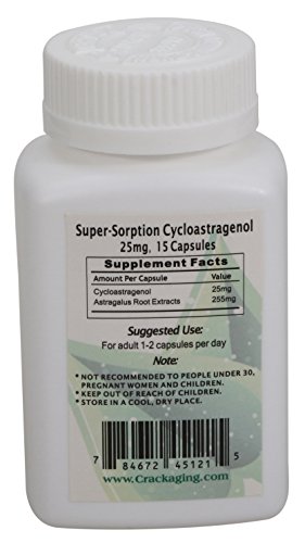 Studio : crackaging Publisher : crackaging Binding : Health and Beauty Product Description Introduction: *CrackAging is the #1 brand on Amazon and we've been selling 98% Cycloastragenol products over years. Please check out the product reviews. *100% vegetarian capsules, with the special anti-acid coating, can protect Cycloastragenol from stomach acids so it can reach the intestine intact for better digestion and absorption. Ingredients: *CrackAging CA-100® contains only Cycloastragenol 99% and 100% pure Astragalus root extracts. NO fillers, NO binders, and NO artificial ingredients. Benefits: Anti-aging Improve your immune system Improve your energy level Improve hair growth Better and deeper sleep Suggested Dosage: *If you are in your 30-50's, please take 5mg 1 capsule per day; *If you are in your 50-60's, please take 10mg 1 capsule per day; *If you are in your 70's, please take 25mg 1 capsule per day. *It is strongly recommended to insist on taking these supplements for 3-6 months to feel the effects from the magic supplements. Cautions: *Not recommended for people under 30's, pregnant or nursing women, children, or those with severe liver or kidney disease. *The product is not intended to prevent or cure any disease. By standard definitions, "Aging" is not a disease. 0