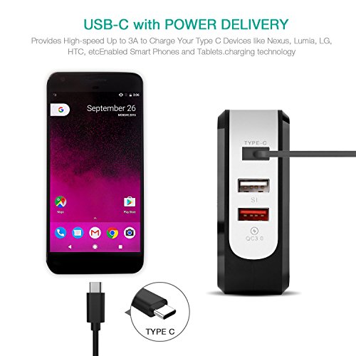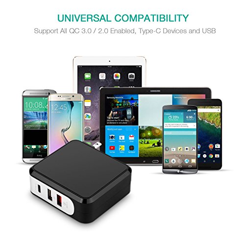 【QC3.0 + Type C + Smart USB 3-IN-1】--- This wall charger designs with a super fast QC 3.0 port, the latest 3A Type C port and a smart identification USB port, compatible with all QC 3.0, backwards to Qualcomm Quick Charge versions 1.0, 2.0 & All USB type-C enable smart phones.