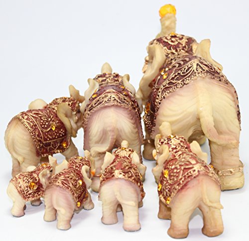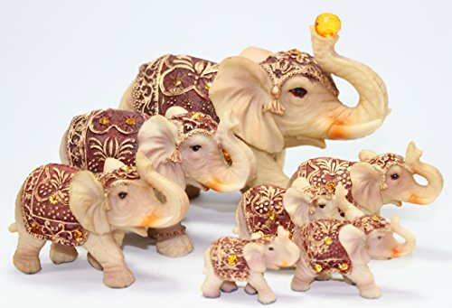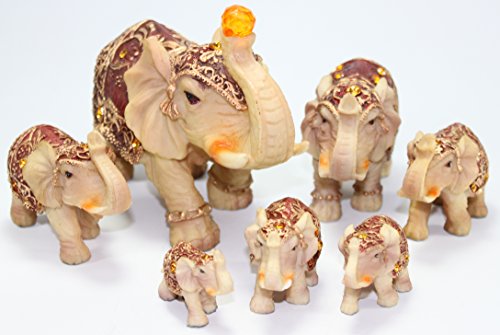 - Feature : Set of 7 Vintage Elephant Family Collection. / Color: Ivory Size: Smallest~1.5"(H) X 2" (L) (approx.) Largest ~ 6"(H) X 8" (L) (approx.) / Elephant symbolizes power, wisdom, strength, fertility, protection of the home!! / Vintage style statues with the trunks facing upwards to represent prosperity, good luck, and success!! The cloak is finely engraved with beautiful gold pattern and lightened with shinning crystals. / Great housewarming gift or decorative statue to put in office, front door, living room and beside the bed.