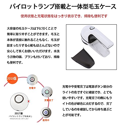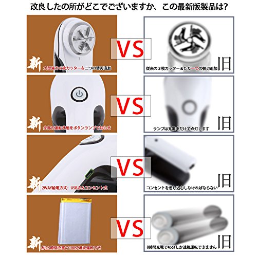 3 USB充電式: USB充電式だから、コンセントだけでなく、パソコン、モバイルバッテリーや車など給電方式から、働きできます。停電やコンセントがない場合でも、使いたい時にすぐに使え、短時間でも毛玉を取り除くことができます。コードレス充電池式、コンパクト設計で旅行や出張にも簡単に持ち運べます。