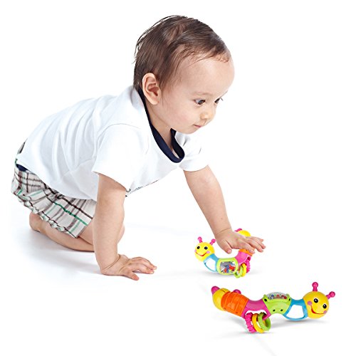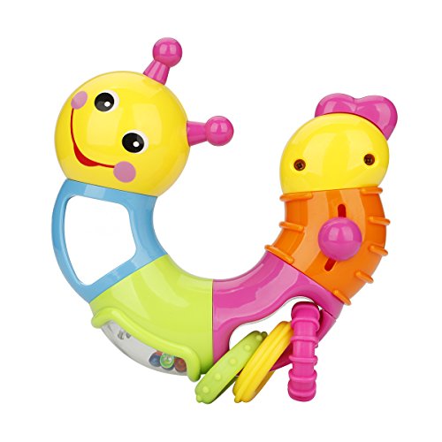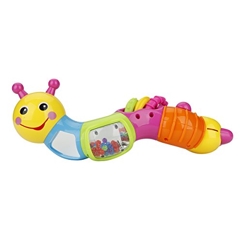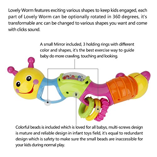 Twisting Rattle features exciting various shapes to keep kids engaged, each sections of the worm rattle can be optionally rotated, a small Mirror included, 3 holding rings with different color and shapes