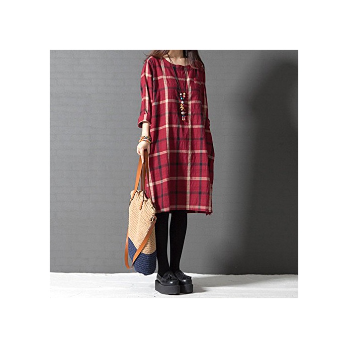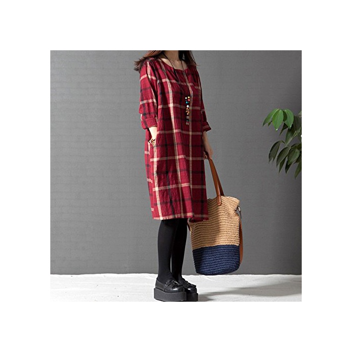 원본상품명: Spargel 秋色 チェック柄 リネン ミディ丈 チュニック ワンピ?ス レディ?ス 長袖 膝丈 大きいサイズ (M, レッド)