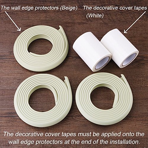 1. Kit includes 3 rolls of edge cushions (20' Ft/6M total), 2 decorative duct tapes (each 13'L x 3"W). 2. Sloped NBR foams absorb impact better, protect kids from bumping walls from being damaged. 3. Securely fastened to walls with duct tapes, provides no gap for little hands to peel off no biting off for choking hazard.