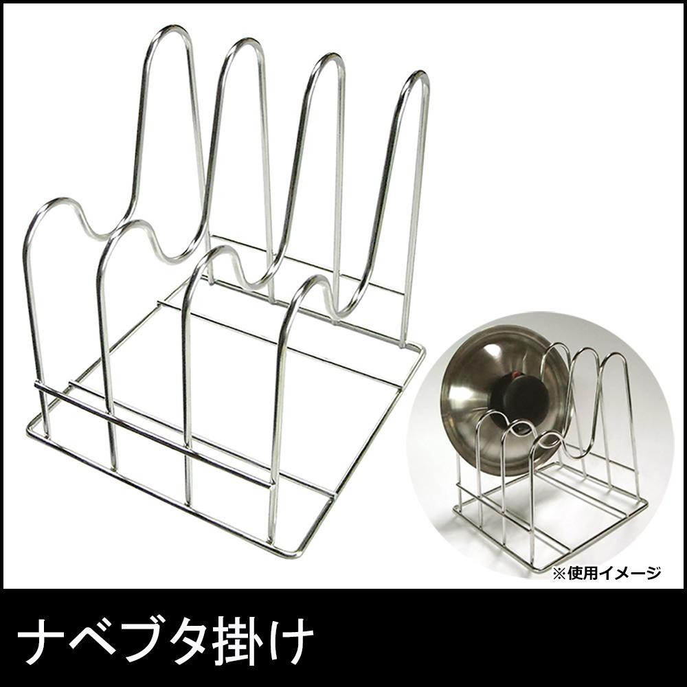 収納するのに、あると便利なフタ用ラックです。 製造国:日本 素材・材質:18-8ステンレス 商品サイズ:(約)18×17×H19cm 仕様:完成品 ※サプライヤー直送品【商品名】ナベブタ掛け
