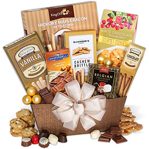 -. Feature : Free shipping! New 2017 design! / Send holiday cheer with this festive gift basket, exclusively from GourmetGiftBaskets.com! Inside a gorgeous gift box your recipient will find classic holiday treats and gourmet snacks. / Gourmet holiday foods include caramel milk chocolate squares, our exclusive KingofPOP Hickory Maple Bacon Popcorn, vanilla wafer rolls, Belgian chocolates, cashew brittle, chocolate wafer rolls, and white chocolate cranberry cookies! / Keepsake gift box with gourmet holiday foods is professionally shrink wrapped with a festive ribbon. / 100% Satisfaction Guarantee for you and your recipient only from seller GourmetGiftBaskets.com!