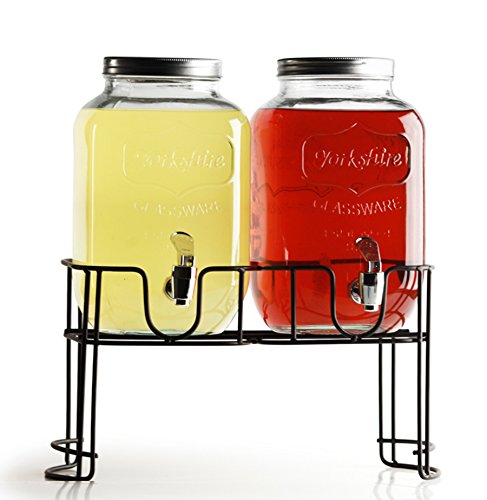 Double Yorkshire Mason Jar Glass Beverage Drink Dispensers with Metal Stand, 1 Gallon Each, 2 Gallon Total 100% Lead Free. Ideal for all types of cold beverages. Shaped to perfection. Base provides maximum stability. Made of clear glass enabling the color of the beverage to shine. Glass enhances and preserves the beverages aromas and flavors unlike plastic and acrylic dispensers. Elegant look adds to any events aesthetics. Great for parties, just add some ice tea mix, save money on bottled drinks, relax and save the mess. These are perfect for: Christmas, Birthday Gifts, Wedding Party, Your best selling beverage, Valentine's Day, Anniversary, Father's Day, Mother's Day, Housewarming, Cyber Monday and Black Friday sale gifts, New Years, College Graduation, St. Patrick's Day, Congratulations, Job Promotion, New Job, Stocking Stuffers and Secret Santa Gifts