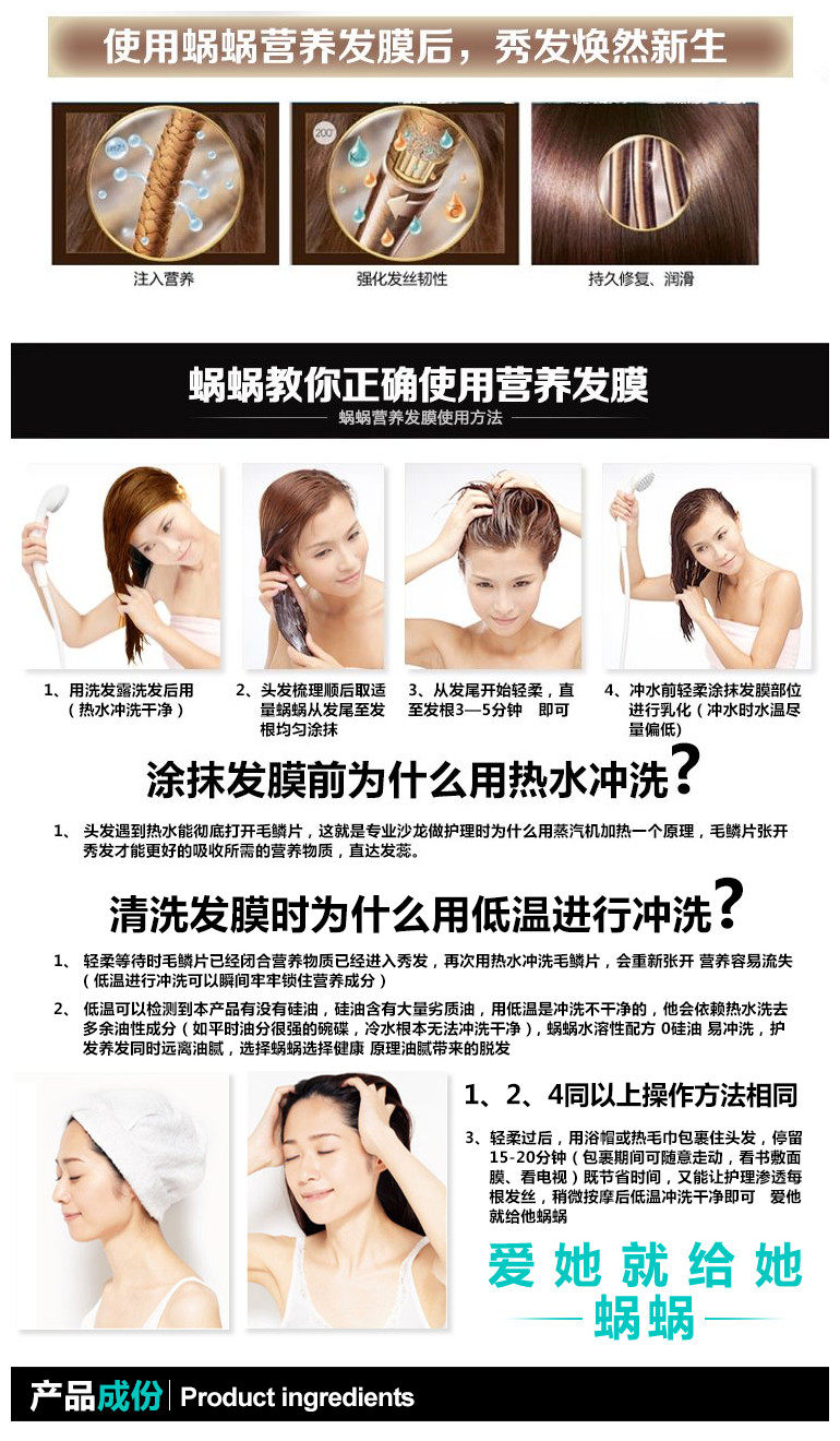After shampooing, use a wet towel dry hair, apply a few drops of this product, in the smear, Fashao, rough and damaged parts can increase dosage. Until after the products penetrate the hair, hair dryer can be. Dry hair can also be used. Especially in dye has better effect to use, due to the use of plant components, so it can be to oil but not greasy, highly effective absorption.