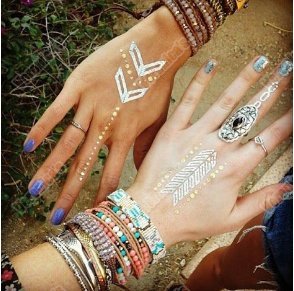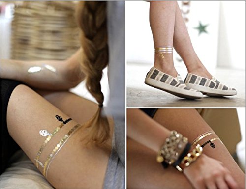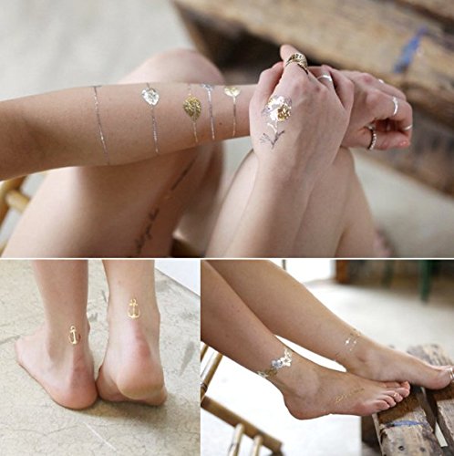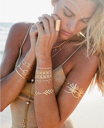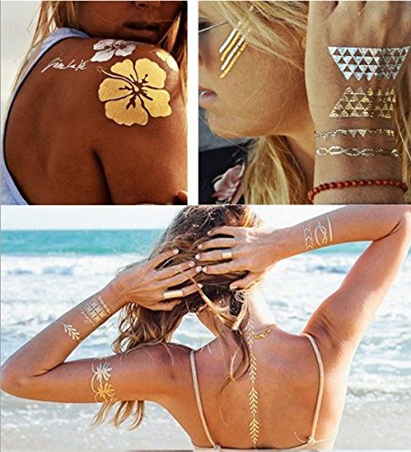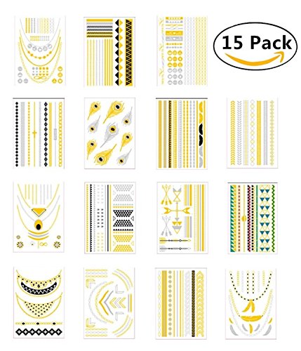 -. Feature : *Quality waterproof tattoos - 100% waterproof and sweat-proof, tattoo may last for 3-5 days and keep its flash & shiny luster according to the position you stick. These stylish tattoos are non-toxic and safe to wear, and can be worn anywhere on your body you like, such as waist, chest, neck, arms, back, legs, bikini, you can also use it to cover scars, etc. / *Over 200+ stunning designs (Random Patterns) - 15 sheets temporary stylish tattoos with the size 8.3 x 5.9 inches, more than 200+ vibrant shimmer tattoo designs in gold and silver with a beautiful splash of turquoise and black. They are very latest hot & trendy designs, including feathers, flowers, birds, chevrons, stars, moons, tribal, necklaces, bracelets and many more. / *Easy to apply and remove - These stylish foil tattoos are easily removable by rubbing alcohol or baby oil, coconut oil, or olive oil. Wait 10 seconds, rub alcohol or baby oil until removed. Please avoid soap, sunscreen and oils to prolong the life of your tattoos if you want to keep it for a few days. / *Create Your Own Body or Craft Art - Easily customize and create your own unique body art! With a touch of metallic tattoo bling, you will make any bachelorette party more fun and fabulous or enjoy using them at the beach to add fun to your swimwear and summer wardrobe. Use them to decorate everything well, including your handbag, cosmetic container, laptop as well as cell phone, make your carryon sparkly and cute. / *Perfect for Various Occasions - Gorgeous and bright Designs will accessorize your outfits perfectly when you go to the music festivals yoga vacations costumes concerts bachelorette parties etc. Also A good choice for beach, at festivals, Halloween, Christmas parties, nightclub, concerts, weddings or any occasion, these tattoos will make you look different. And you can share with your friends, lover or family members as a meaningful sign.
