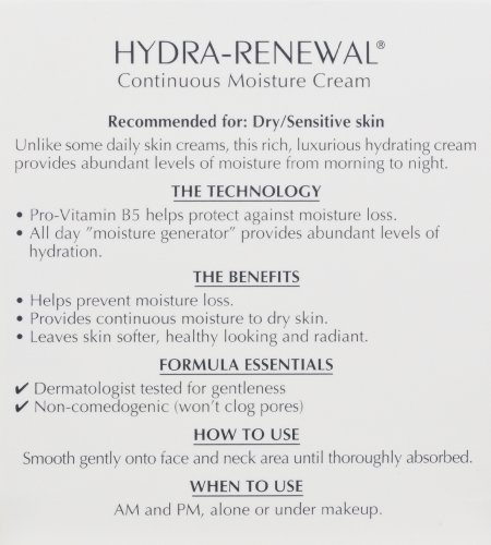 Rich, luxurious cream is perfect for women with dry, sensitive skin. With Pro-Vitamin B5, moisture is continuously released to hydrate skin all day long. Skin is softer, healthy looking, and radiant. • Pro-Vitamin B5 formula helps dry skin • Provides continues moisture to dry skin • Dermatologist tested for gentleness • Apply morning and night after cleansing skin, alone or under makeup. Smooth gently until thoroughly absorbed.Feature