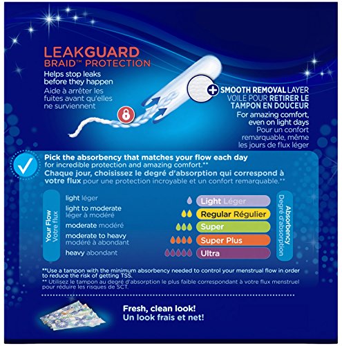 Get protection and comfort every time! Only Tampax has a unique LeakGuard Braid that helps stop leaks by channeling them back into the core, giving you ultimate protection even on your heaviest days. The Smooth Removal Layer gives you amazing comfort, even on your lightest days. Insertion of the tampon is always easy and comfortable with the smooth Pearl applicator. FormFit protection helps close the gaps that can cause leaks, giving you up to 8 hours of protection. Tampax Pearl tampons come in a variety of absorbencies so you're protected from your light days to your heavy days. Feel confident with Tampax Pearl, knowing that you get protection and comfort all day.Feature
