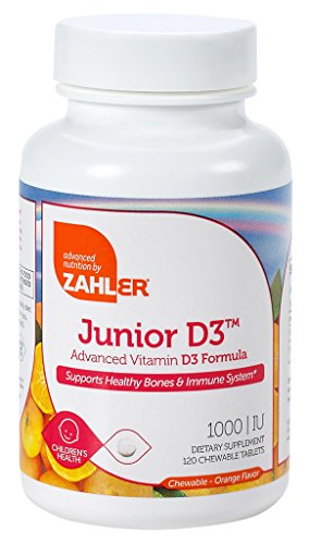 -. Feature : ABOUT: Zahler's Junior D3 is a Kids Vitamin D and a crucial nutrient for overall health specifically maintaining strong muscles, bones, teeth and Immune system / BENEFITS: Junior D3, chewable vitamin d for children provides all the benefits of vitamin D without the risk of unprotected exposure to UVB rays / OPTIMAL FORMULA: Junior D3 contains 1000 IU of vitamin D which is the recommended dose for children / ALL NATURAL SAFE AND EFFECTIVE: Great tasting orange flavored chewable tablets / MADE IN THE USA: Manufactured and bottled in a state of the art GMP and NSF certified facility