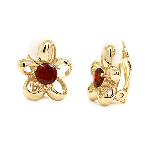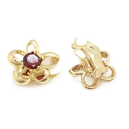 Made of brass with gold plated finish, these open flowers are set with sparkling red CZ stones. Clip on backings secured these earrings. These fashion clip on earrings will make the perfect choice for your special someone for Valentine's gift, Christmas gift, Mothers day gift, Birthday gift, Anniversary Gift, or Bridal party gifts.Feature