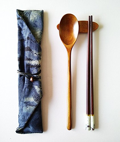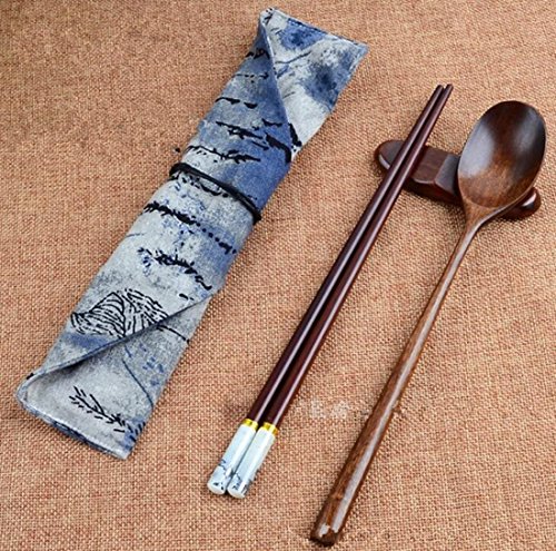 Helen Ou@ Wood Cutlery Set Wooden Chopsticks and Spoon and Tableware Bag and Holder Style C