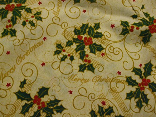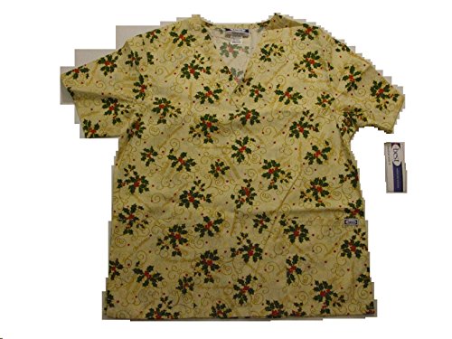Christmas Holiday Scrub Top with Green & Red Holly Leaves & Gold Musical Notes on a Cream Background, V-Neck, Two Front Pockets, 55% Cotton, 45% Polyester