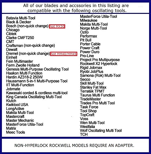 Accessories will fit the following multi-tools:Black & Decker, Bosch, Craftsman, Chicago, Cougar, DeWalt, Dremel, Driving Force, EINHELL, Falke Tool Mate, Fein Multimaster, Ferm Zwolle Holland, Genesis, HARDIN, Harbor Freight, Haussmann, Ideenshop, IIT, King Canada, LongActive, Mastercraft, Master Mechanic, Matrix, MEEC, Millarco prof, Milwaukee, Ozito, Power Craft, Porter Cable, Power Duro, Pro-Line, Ridgid Jobmax, Rockwell & Worx Sonicrafter Hyperlock,Rock Worth, Samona, Seeco, Skil, TradeMaster, Task Force, TopCraft, Westfalia, Work Best.