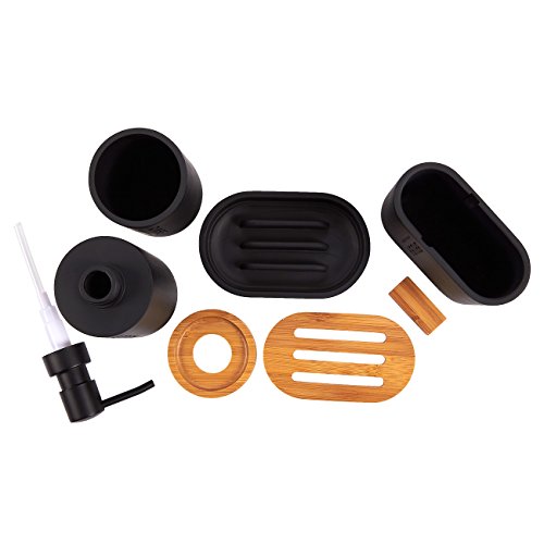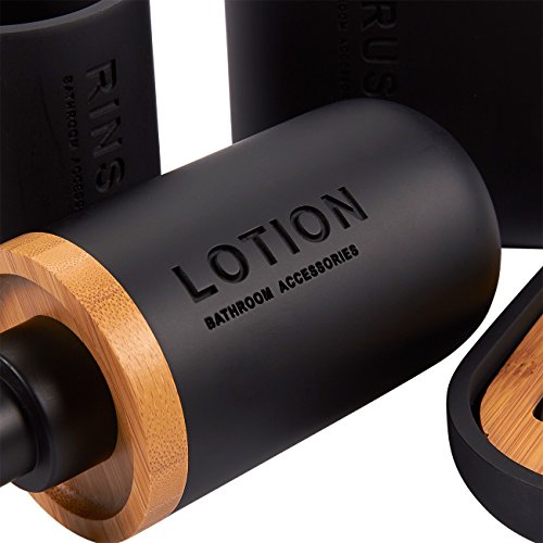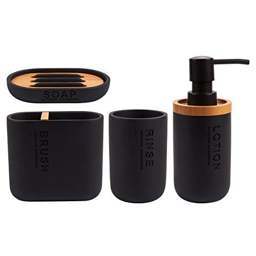 Studio : Juvale Publisher : Juvale Product Description Upgrade the look of your bathroom with this 4-piece bathroom accessory set. With its use of matte black resin accented with wood, this bathroom accessory set is an excellent fit for most types of bathroom decor. Not only does it provide a modern and contemporary look to your bathroom, it is also very functional. Save space on your bathroom vanity by storing your toothbrush and tooth paste vertically in the toothbrush holder. The perforated wood piece in the soap dish lets leftover water drain from your bar of soap, leaving you with dry soap the next time you use it. 0