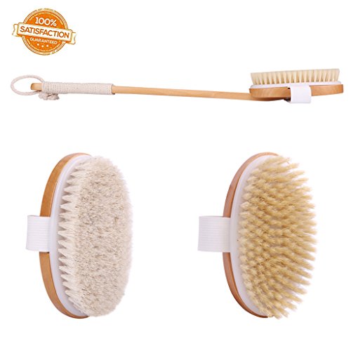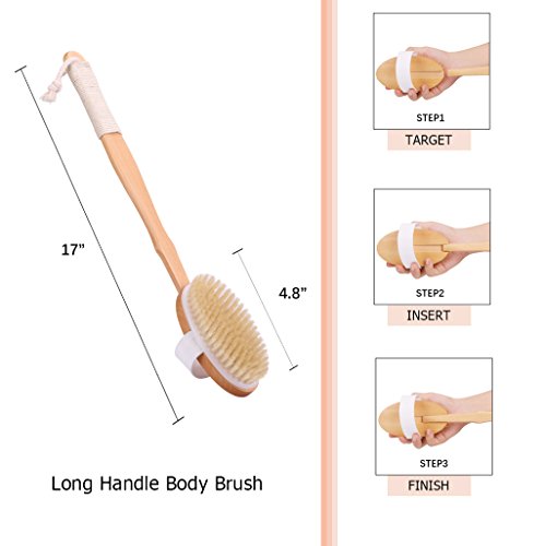 Dry Skin Brushing Body Brush Set-Back Scrubber Bath Brush With Detachable Long Handle For Cellulite Treatment,Exfoliates,Stimulates Blood Circulation-Boar Bristle Shower Brush For Women and Men