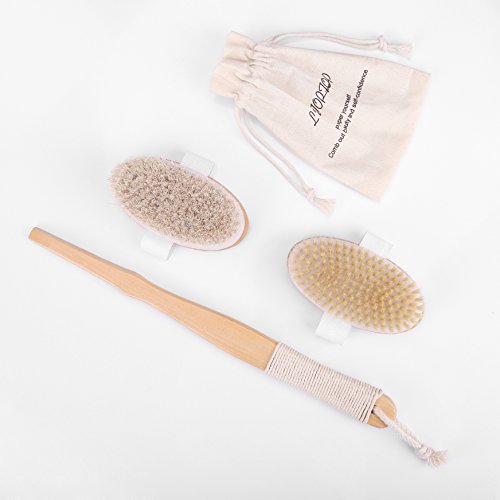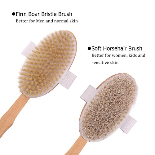 REPLACEABLE BRUSH HEAD- Each bath body brush set is equipped with a boar bristle brush head and a horsehair brush head. Soft horsehair brush is suitable for women and kids while harder boar bristle brush is better for men.