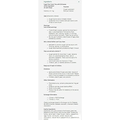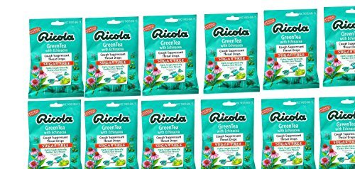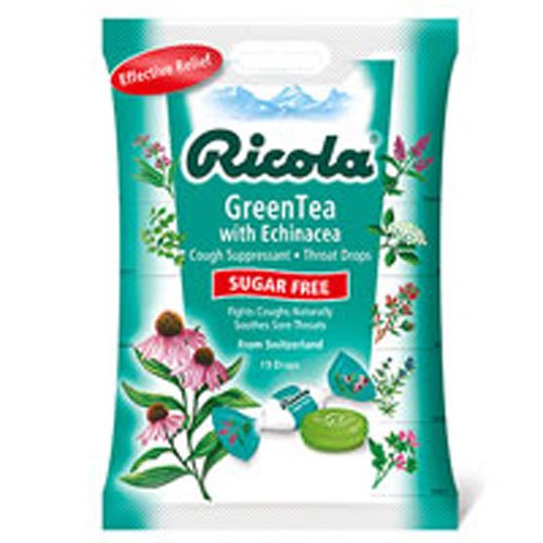 Product Description Ricola Sugar Free Green Tea Cough Drops contain natural menthol to relieve sore throats along with Echinacea, and Ricola's delicious mixture of Swiss alpine herbs. 0