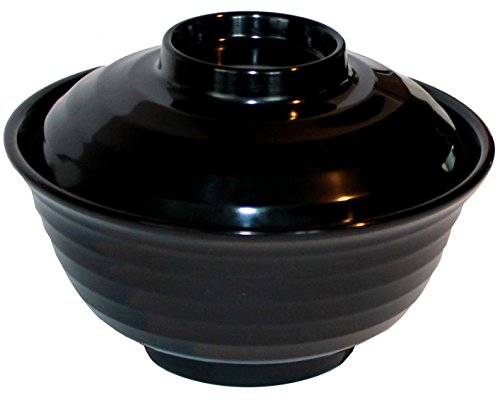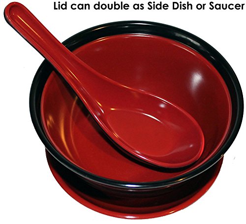Japanese Rice / Soup Bowl Set with Lid, Spoon, and Pan Scraper, Melamine, Red and Black (4-Pack, 10 Ounce, 4.75 Inch)
