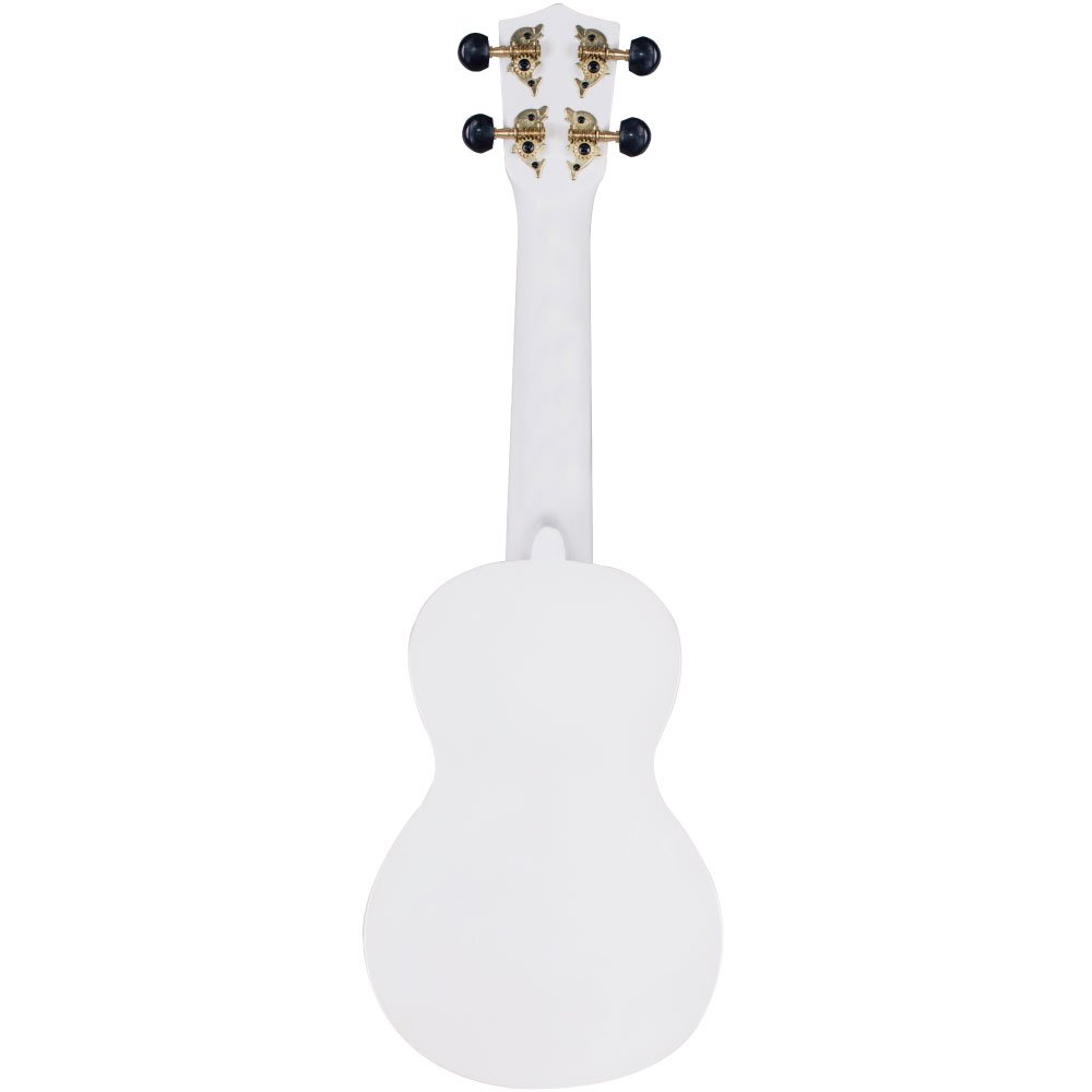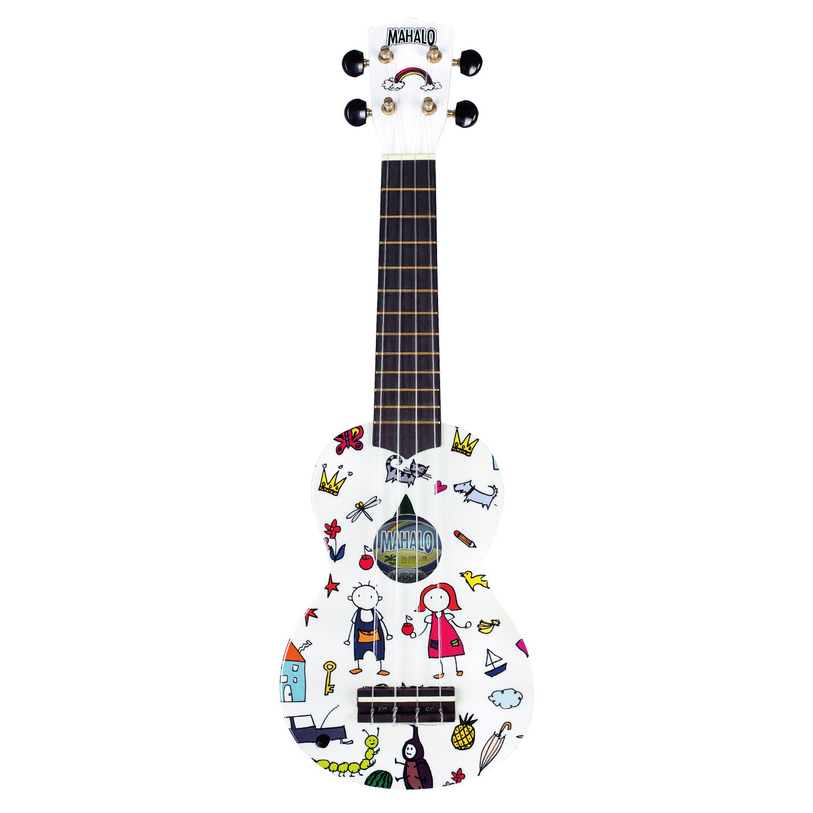 It is a pretty soprano ukulele with a rainbow on the head and a loose and cute piece-full illustration on the body.