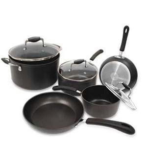 -. Feature : Slate colored aluminum / Tempered glass lids / Set includes 8 and 9.5 inch fry pans, 1.5 and 3 quart covered saucepans, and an 8 quart covered stockpot / Silicone handles / PFOA free