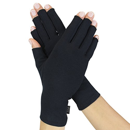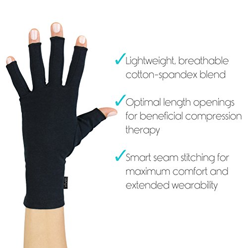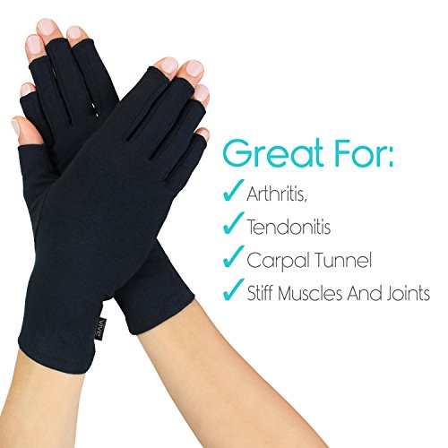 EFFECTIVE ARTHRITIS AND CARPAL TUNNEL RELIEF Form-fitting, cotton-spandex blend embraces the natural shape of your hand with compression therapy support. Relieves your tendons, muscles and joints from arthritis pain by reducing stress on pressure points. OPEN FINGER DESIGN Perform everyday tasks like using phone, typing, cooking and more without interference. Opening is set at optimal length to provide perfect balance between beneficial compression support and finger / thumb mobility. ALL DAY WEAR Lightweight, breathable cotton-spandex material will allow you to wear the gloves comfortably all day long. Temperature regulating - retains heat to soothe hands and knuckles without becoming stuffy. SMART SEAM STITCHING Minimal stitching to reduce irritation and maximize comfort. 2017 stitching updates make the gloves more durable and long lasting than ever. WHAT'S INCLUDED - One Pair of Arthritis Gloves