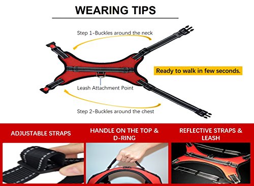 3.Hassle Free Walk Easily place the harness over your dog's back, buckles straps around the chest and neck, attach a leash on the D-Ring point and you are ready for a hassle-free walk.