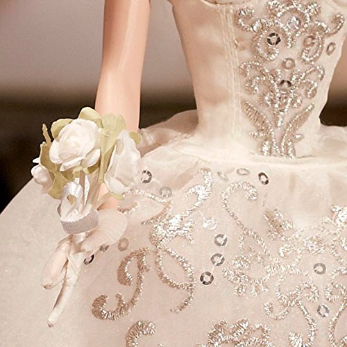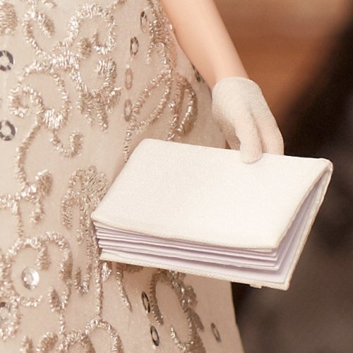 Inspired by the rich, evocative fashion of Milan's runways, Barbie Design Director Robert Best captures the aesthetic of this fashion capital with designs and details that offer tribute to the region's rich clothing and textile industries. All eyes will be on this bride, whether she's walking the runway or the aisle. With a tea-length hem, the bell-shaped skirt on this wedding dress rings gorgeous. Classic white is modernized with a silvery filigree on the bodice and upper skirt. Interwoven sequins add a touch of romantic sparkle. A sweetheart neckline stands out with cutout accents and sheer puffs of sleeve lying off the shoulder. It's the perfect frame for this beautiful bride, with her sparkling makeup and gorgeous hair. A silvery tiara with diamond-like “gems” holds her short veil in place; lace-like trim matches the bodice. The wedding look is complete with short white gloves, sheer white stockings and white sling back shoes. Picture-perfect accessories include a bouquet of white flowers and a lacy clutch, both of which fit in her hands. She'll have collectors saying, “I do!”Feature