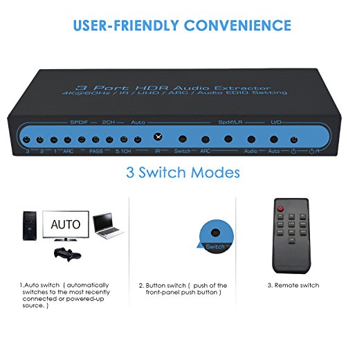 3 Port HDMI Audio Extractor support ARC,3D and HDR, 4KX2K,which can switch easily three HD Sources to one HD Display. Also any of the input sources support the audio extract by the SPDIF and LR audio output channel. The Switcher supports ARC function that can do TV audio return back to the AV receiver.