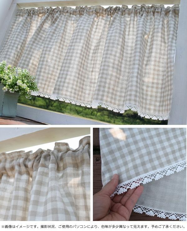 | 肌触りの良いダブルガーゼ生地にトーションレースをあしらったナチュラルで柔らかな雰囲気のカフェカーテンです。お手持ちのポール(つっぱり棒)にかけてお使い下さい。 |
