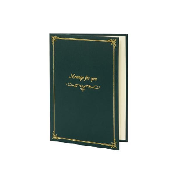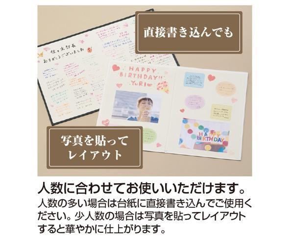 高級感のあるレザー調の表紙。切り取って配布できる便利なメッセージシール付。直接書き込んだり写真を貼ったり、レイアウト自在。 |