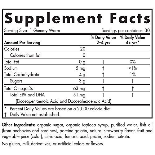 Nordic Omega 3 Gummy Worms provide kids with the omega 3 essential fatty acids they need for optimal health. Each pure and great tasting chewable gummy delivers 250 mg of the omega 3 EPA DHA. Kids enjoy the bright, clean, strawberry taste, and parents love Nordic Omega 3 Gummy Worms for their on the go convenience. Delicious omega 3 nutrients, in a fun, worm shaped jellie... who can resist? These are a great way to start your toddler on a children's vitamin they will look forward to taking. But they're not just for kids. Omega-3 fatty acids help support healthy heart function in adults, too. The best part is they are all natural. They have no artificial flavors or preservatives and are gelatin, gluten and diary free.