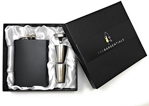 Product Description Cheers! You've found the perfect present for a boyfriend, a bridesmaid, annual fishing trip buddies, that white elephant gift receiver, or anyone else who enjoys a stylish sip on-the-go. Our 8 ounce black matte flask is sturdy enough to handle the bumps of a camping trip and light-weight enough to not slow you down on the wedding dance floor. The set comes with a funnel for easy filling, and 4 1-ounce stainless steel shot cups so that you can share your spirits with friends. 0