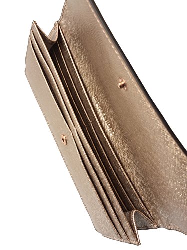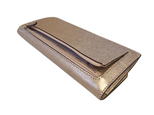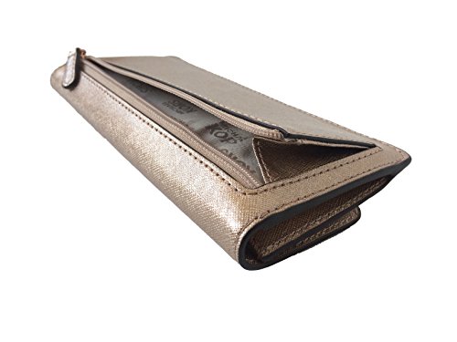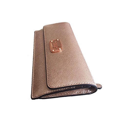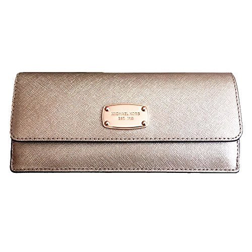 Binding : Apparel Product Description This slim flat wallet from Michael Kors is wrapped in metallic rose gold safiano finished leather with polished rose gold tone hardware. This flap style wallet is accented with Kors logo nameplate on the front and secures with a snap closure. The nameplate has been updated with an elevated profile and rounded corners. The leather and fabric interior features 8 credit card slots, and 2 full length bill compartments. There's an accordion zippered coin compartment on the back. It measures approximately 7.75 inches (L) x 3.75 inches (H) x 1 inch (W). MSRP of $108.00. 0