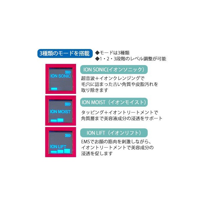 ◆파워 업 포인트◆ 메인의 워터 pea 링 기능으로,이온 클린싱 기능을 플러스.게다가EMS에 얼굴의 살코기를 자극 하면서 이온 트리트먼트 기능으로,피부에 미용액을 침투 시키는 바와 같이(하도록) 서포트.3종류의 모드를 탑재 1대로 에스테틱의 코스와 같은 케어가 집에서 간단하게로 와 ##고 있습니다!모드는 3종류에서 선택 성과,123단계의 레벨 조정이 가능. 「ION SONIC(이온 소닉)」 초음파+이온 클린싱에 모공에 가득찬 오래된 각질이나 피지 얼룩을 없앱니다.초음파 케어와이라고 이온 클린싱을 동시에 행하는 것(일)에 꽈모공에 가득찬 얼룩을 보다 많이 깨끗이 하게 해 줍니다. 「ION MOIST(이온 모이스트)」 tapping+이온 트리트먼트에 각질층까지 미용액 성분의 침투를 서포트.미용액을 피부에 친해지게 하는 파《딘구》를 자동으로 행하고, 미약한 진동으로 피부에 미용액의 침투를 서포트. 「ION LIFT(이온 리프트)」 EMS+이온 트리트먼트에 얼굴을 케어 해 갑니다.EMS에 얼굴의 근육을 자극 하면서,미용액을 사용하면 이온 트리트먼트에 동시에 미용 성분의 침투를 재촉합니다.