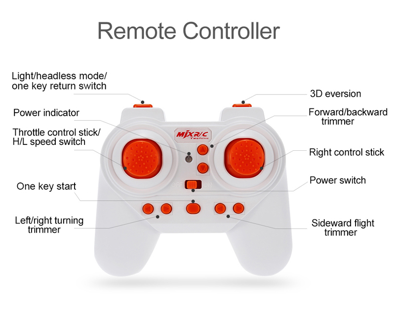 Functions: 3D roll, air pressure altitude hold, headless mode, one key return, one key star, sideward flight, H/L speed, turn left/right, up/down, with light?
