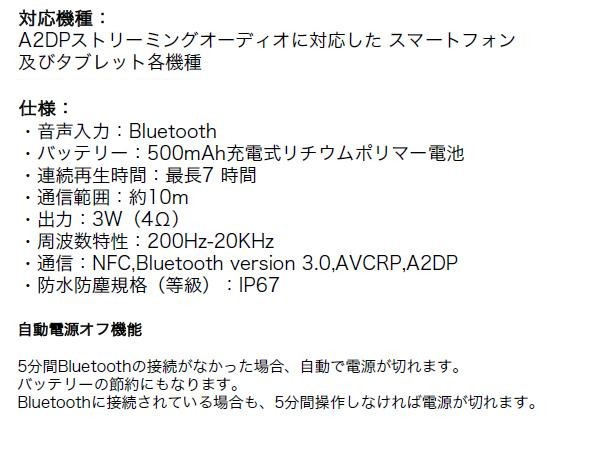 | 耐衝撃性に優れたシリコン製のボディです。充電時間約3時間で最長7時間の再生が可能!水面に浮く構造で、プールや海などでご使用頂けます。持ち運びに便利なカラビナ付き。 |