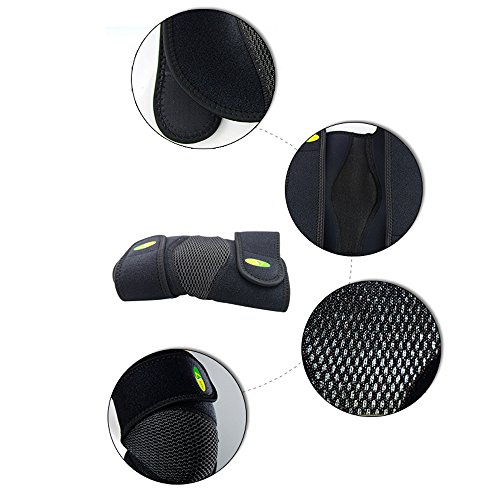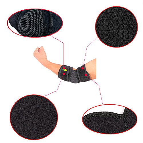 -. Feature : Suitable all sports: Football, basketball, baseball, volleyball, camping, hiking, ice hockey, tennis, skating, fishing, golf, cricket, cycling, racing, running, soccer, climbing, mountain-climbing, Yoga, hunting and so on. / The Sports Elbow Protector is great for helping with sprains, strains and helps to prevent more injuries. / Ideal for the Healing and Prevention of Sporting Injuries. / Color: Black; Material: OK cloth, neoprene, nylon cloth / Size: 38.1*19.05cm, that is 15*7 inch;One size fit most, for men and women