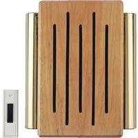 -. Feature : Carlon RC3306F Wireless Battery Operated Chime / 13 Selectable Sounds. 32 Selectable Codes To Block Interference / Real Natural Wood Cover with Decorative Brass Tubes / Adjustable volume control. 4" Speaker For Crisp, Clear Sound / Up to 150' operating range. Wireless push button included.