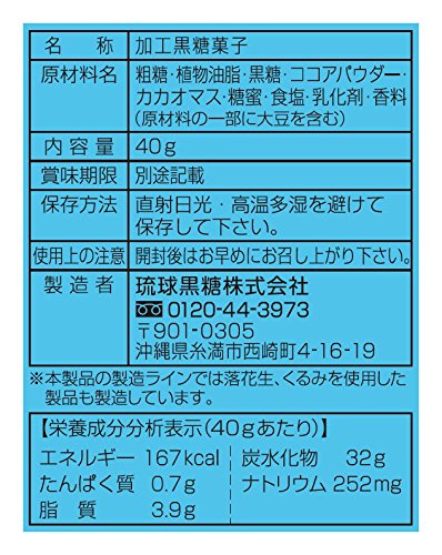 原材料:粗糖、植物油脂、黒糖、ココアパウダー、カカオマス、糖蜜、食塩、乳化剤、香料(原材料の一部に大豆を含む)